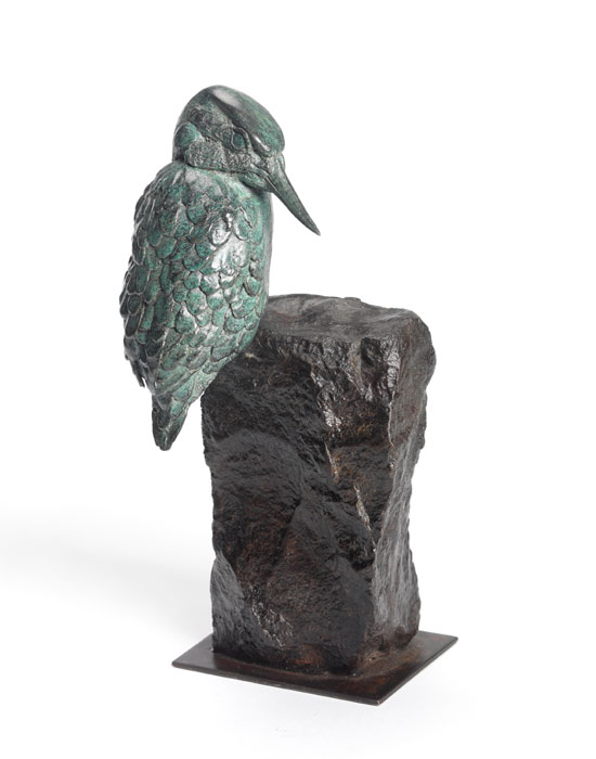 (Limited Edition of 12) 4/12 “Once again this idea came from a painting. Having watched a Wren in an old barn where pumpkins and gourds were being stored, I combined the two for a painting and subsequent bronze”. Kingfisher