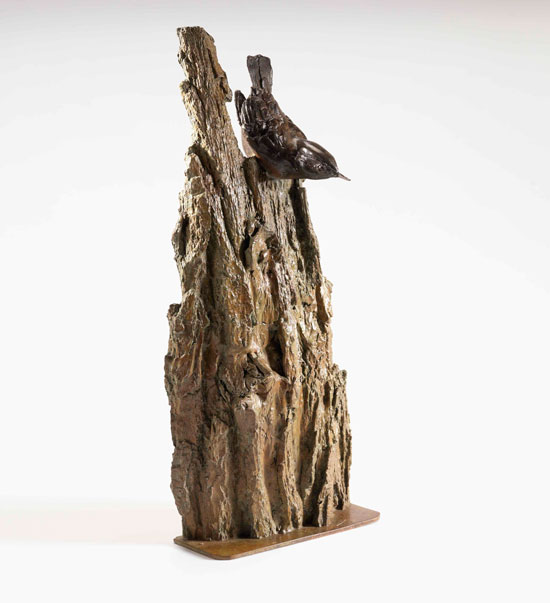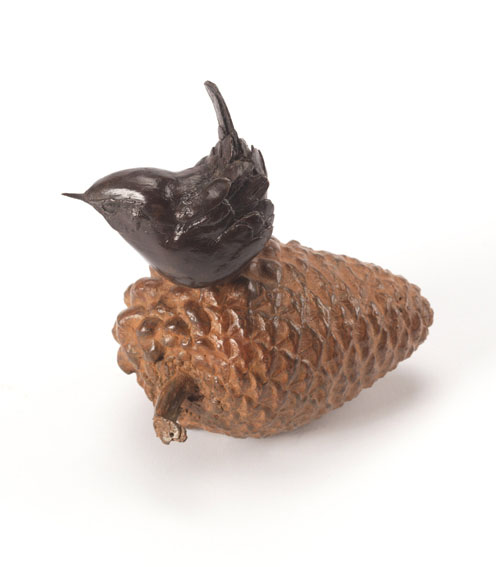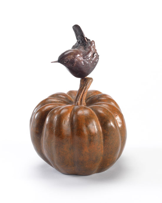 (Limited Edition of 12) 3/12 “Birdwatching one morning I watched a Nuthatch descend a Scots Pine. The unusual angle, typical of a Nuthatch, against the rough textured trunk and using a patina to accentuate the colours of this ingrained and weathered bark have made a beautiful statement bronze”. Wren on Pumpkin