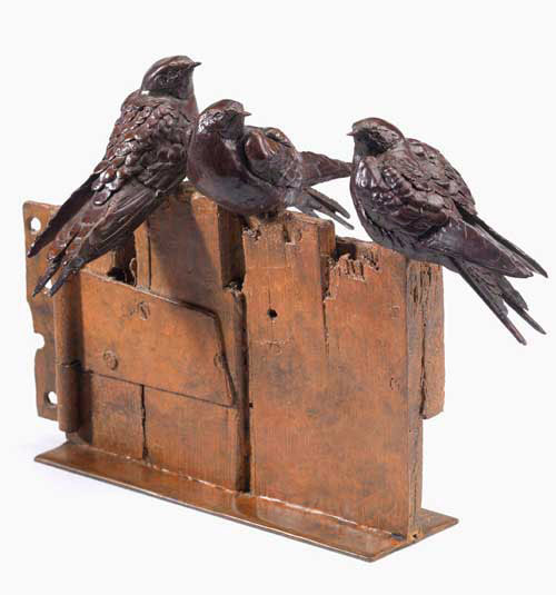 (Limited Edition of 12) 6/12 “Being a trout fisherman I often see a Kingfisher on the river and love watching them. It was a challenge to produce a bronze, but with the verdigris patina on the Kingfisher I think it complements the piece beautifully and evokes that flash of turquoise which is often all you see”. Swallows on Stable Door